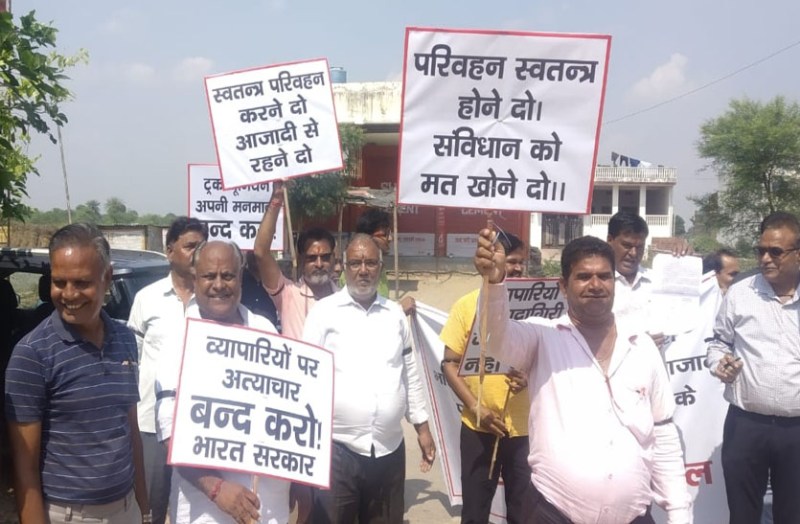 ट्रक यूनियन व व्यापार मंडल में गहराया विवाद, हाथों में तख्तियां लेकर व्यापारियों ने निकाली विरोध रैली