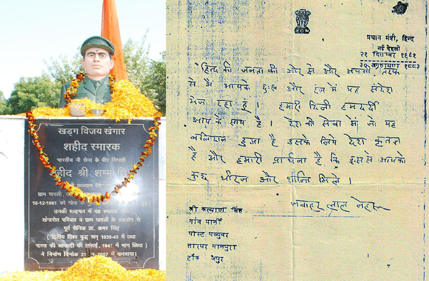 टोंक के सपूत को शहीद होने पर पीएम नेहरू ने पत्र लिख परिजनों को दी थी सांत्वना