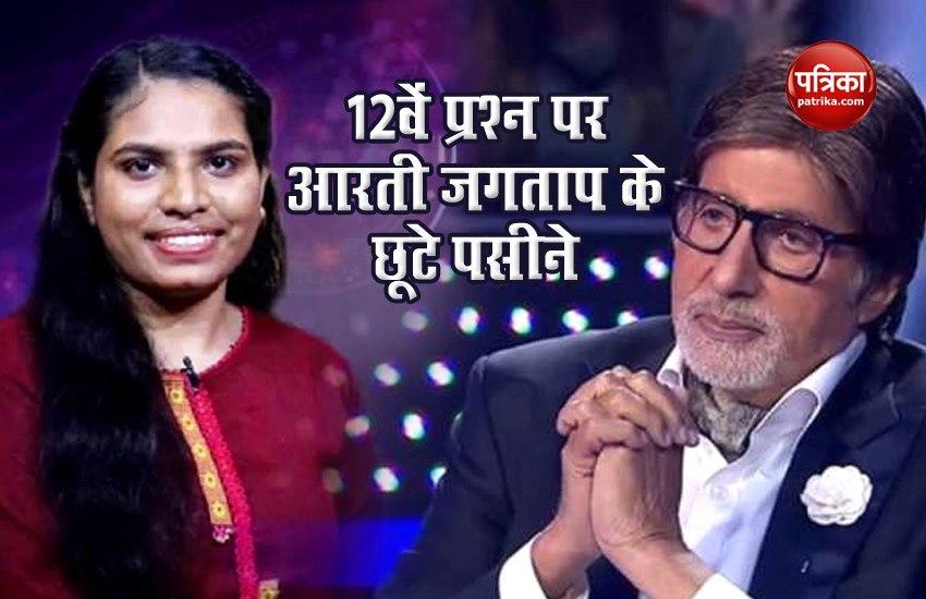 नई दिल्ली। एक बार फिर से टीवी का मोस्ट पॉपुलर क्वीज शो 'Kaun Banega Crorepati' लौट आया है। KBC के 12वें सीज़न ने बीती रात टीवी पर शानदार वापसी की है। शो में होस्ट की भूमिका निभाने वाले अमिताभ बच्चन की एंट्री से उनकी एक्साइटमेंट का अंदाजा लगाया गया। उन्होंने बड़ी ही गर्मजोशी के साथ शो का शुभारंभ किया। कौन बनेगा करोड़पति 12 की पहली प्रतिभागी के रूप में मध्यप्रदेश की आरती जगताप को हॉट सीट पर बैठने का मौका मिला। आरती ने खेल की शुरूआत सभी सवालों के सही जवाब देकर की, लेकिन 12 लाख 50 हज़ार के सवाल पर वह ऐसी अटकी की उन्हें शो को छोड़ना पड़ना।