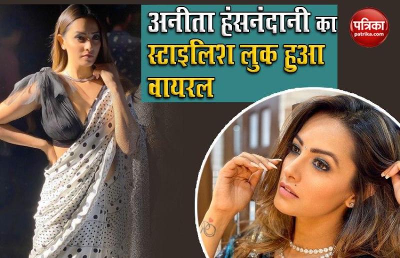व्हाइट एंड ब्लैक पोल्का डॉट साड़ी अनिता ने रफल स्लीव डीप वी नेक ब्लाउज पहन रखा है जिसमें उनका लुक हटकर नजर आ रहा है।