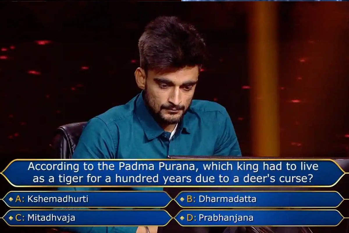 मंगलवार को केबीसी के शो में होस्ट अमिताभ बच्चन ने जसकरण सिंह से 7 करोड़ का सवाल पूछा। ये सवाल था- पद्म पुराण के अनुसार, किस राजा को हिरण के श्राप के कारण सौ साल तक बाघ के रूप में रहना पड़ा था? इस सवाल के जवाब के लिए विकल्प थे- ए- क्षेमधूर्ति, बी- धर्मदत्त, सी- मितध्वज और डी- प्रभंजन।