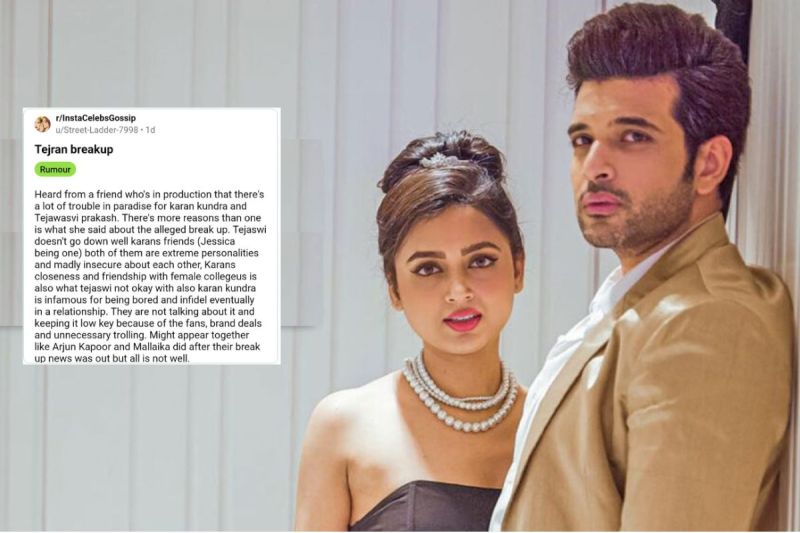 करण कुंद्रा और तेजस्वी के ब्रेकअप से जुड़ा हुआ पोस्ट रेडिट पर वायरल हो रहा है। इसमें दोनों के रिश्ते के टूटने को कंफर्म बताया जा रहा है। साथ ही इस ब्रेकअप की वजह भी बताई जा रही है। ब्रेकअप का पोस्ट सोशल मीडिया पर तहलका मचा रहा है। इस पोस्ट में लिखा है, 'प्रोडक्शन हाउस के करीबी दोस्त से पता चला है कि करण और तेजस्वी के बीच काफी दिक्कतें आ रही थीं। अब फाइनली इन दोनों का ब्रेकअप हो गया है, जिसके पीछे कई सारी वजह हैं। करण और तेजस्वी दोनों की पर्सनैलिटी में काफी दिक्कत है और एक दूसरे के लिए दोनों काफी ज्यादा इंसिक्योर भी है। तेजस्वी को करण की फीमेल दोस्तों से ज्यादा नजदीकियां पसंद नहीं है। दोनों अपने ब्रेकअप की बात इसलिए नहीं बता रहे हैं क्योंकि दोनों की फैन फॉलोइंग काफी ज्यादा है। इसके साथ ही दोनों ट्रोलिंग और कई ब्रांड्स डील की वजह से इसे छिपाकर रखना चाहते हैं।"