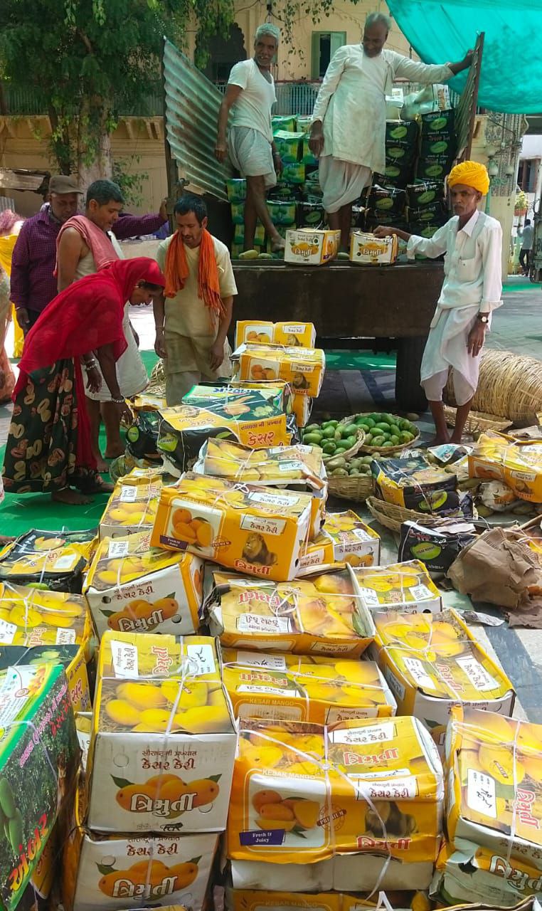 सवा लाख आमों का भोग लगाने से पूर्व साफ कर उनके मुंह को काटा जाता है। भोग लगाने के बाद ये आम सेवाकर्मियों, राजभोग झांकी के सैकड़ों दर्शनार्थियों में बंटते हैं। मंदिर में एक-दो दिन पहले ही देशभर से श्रद्धालु-वैष्णव हापुस, केसर, नीलम, रत्नागिरि सहित कई किस्म के आम भेजते हैं। श्रीनाथजी मंदिर मंडल भी प्रतिवर्ष ८० क्विंटल आम खरीदता है। मुख्य निष्पादनअधिकारी जितेन्द्र ओझा ने बताया कि इस बार ८० क्विंटल आम का भुगतान जूनागढ़ के श्रद्धालु वैष्णव करेंगे। गुजरात से भी कई श्रद्धालु ट्रक भरकर आम भिजवाते रहे हैं।
