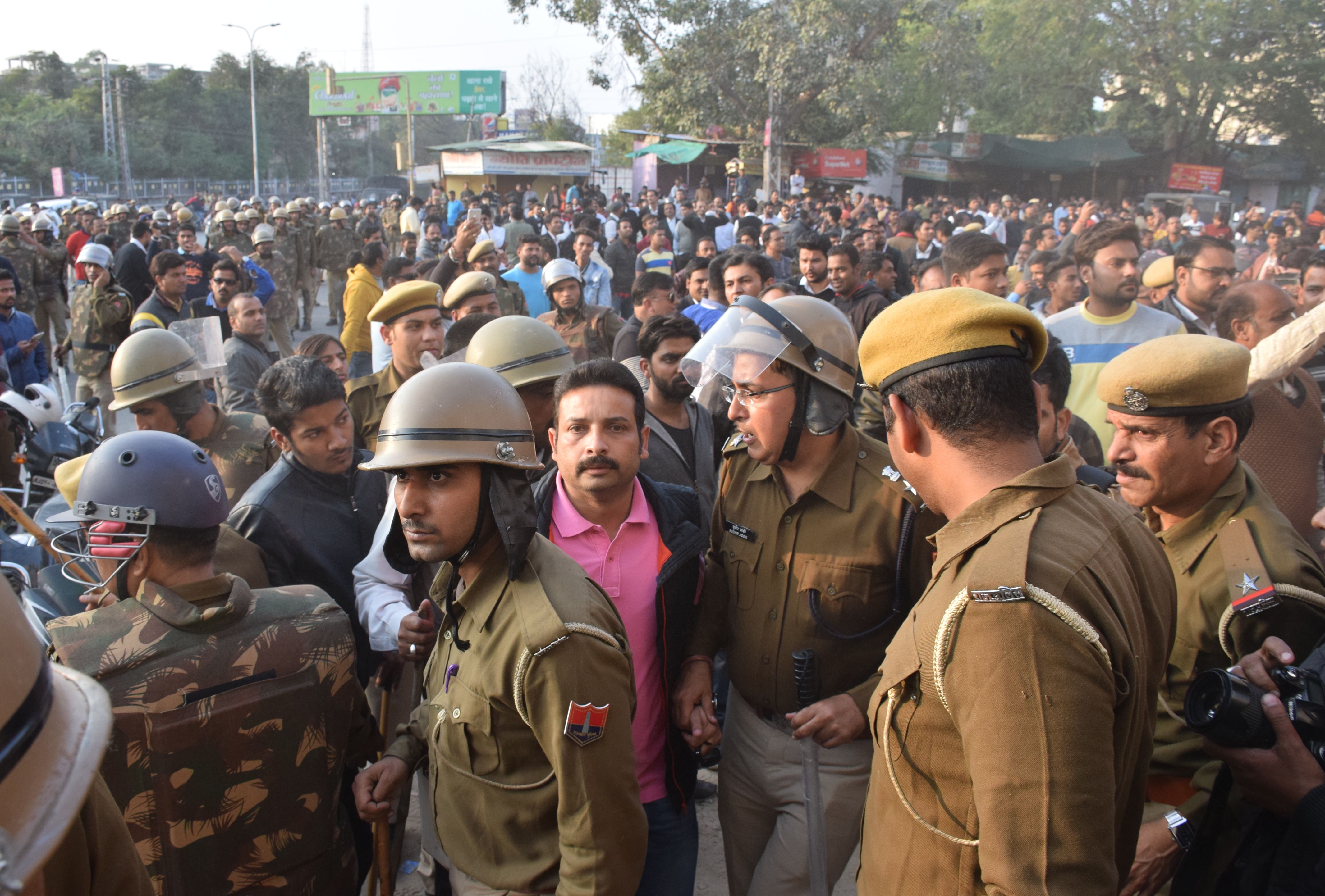 उदयपुर . सोशल मीडिया पर आपत्तिजनक पोस्ट और भडक़ाऊ नारेबाजी के बाद मचे बवाल पर गुरुवार को उदयपुर शहर में धारा 144 निषेधाज्ञा के बीच अतिरिक्त पुलिस अधीक्षक (एएसपी) सुधीर जोशी की पिटाई करते हुए का वीडियो सामने आया है। इस वीडियो में कोर्ट कैम्पस में भीड़ जोशी को घेरते हुए पीट रही थी। गुरुवार को शहर में धारा 144 की जमकर धज्जियां उड़ाते पुलिस को खूब दौड़ाया। संगठनों ने समूह में वाहन रैलियां निकाली, नारेबाजी कर जमकर पथराव करते हुए एएएसपी सहित कई पुलिसकर्मियों को पीटा। पुलिस ने लाठीचार्ज करते हुए रबड़ के गोले भी दागे थे।