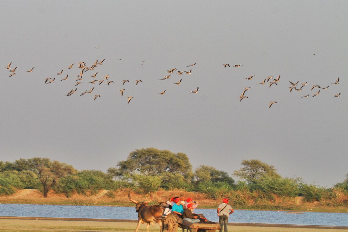 बर्ड विलेज मेनार से लौटते प्रवासी पक्षी।