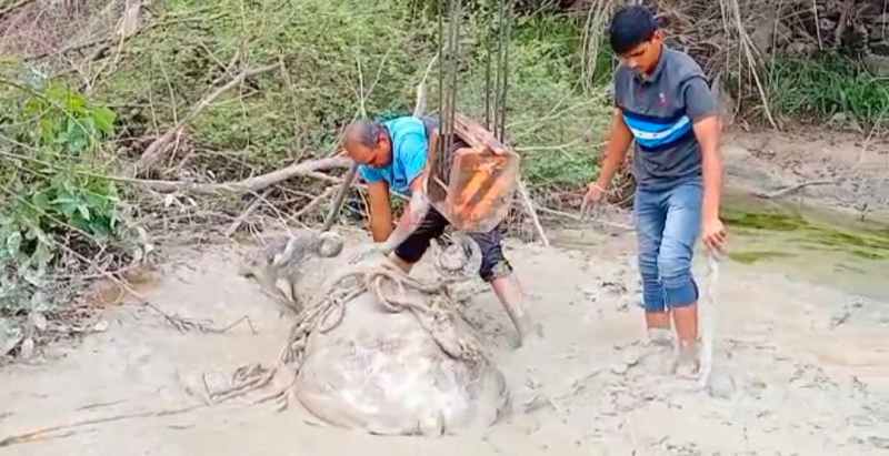 रविवार को बोर का तालाब में एक भैंस फंस गई, देखते ही देखते भैंस चिकनी स्लरी में उतर गई और सिर्फ उसका मुंह ही दिख रहा था। वहां एकत्रित हुए ग्रामीणों ने सारे प्रयास किए लेकिन वे भैंस को नहीं निकाल सके। बाद में हाइवे बनाने वाली सद्भाव कंपनी से आग्रह किया तो उन्होंने मदद के लिए क्रेन और एक अन्य मशीन भेजी। बाद में करीब तीन घंटे तक रेस्क्यू चला, भैंस को सावधानी से क्रेन से ऊपर तो खींच लिया लेकिन वापस नीचे उतर गई। बाद में दूसरी मशीन व ग्रामीणों के सहयोग से उसे निकाला गया। इधर, गांव के ही प्रताप सिंह की एक भैंस भी गायब है जो सोमवार शाम तक नहीं मिली। ग्रामीणों ने बताया कि पूर्व में पांच जानवर वहां मर चुके है।