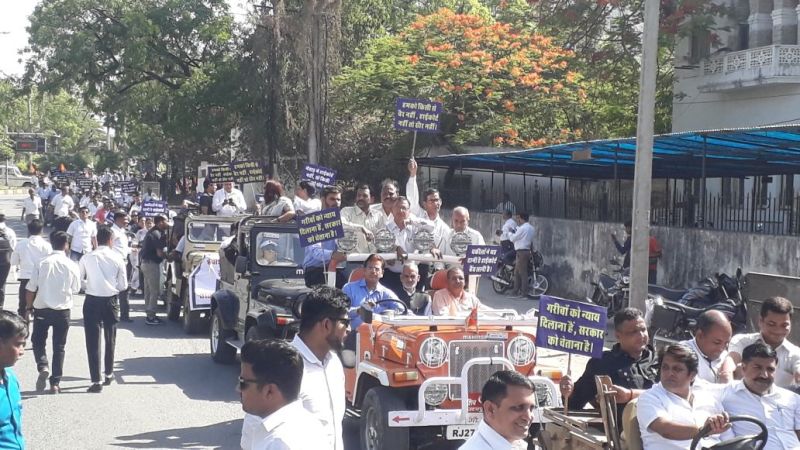 उदयपुर . जो हाईकोर्ट बैंच की बात करेगा - वही राजस्थान पर राज करेगा, मुख्यमंत्री होश में आओ, होश में आकर बात करो, जन जन की यही पुकार - हाई कोर्ट बैंच हाई कोर्ट बैंच..इन नारोंं के बीच हाई कोर्ट बैंच की स्थापना को लेकर क्रमिक अनशन के 22 वेंं दिन अधिवक्ता, सामाजिक संगठन एवं राजनीतिक संगठनों ने उदयपुर शहर में वाहन रैली निकाली। रैली कोर्ट चाैैराहे से प्रारंभ हुई जो देहली गेट, बापू बाजार, सूूरजपोल, झीनीरेत, सिंधी बाजार, घंटाघर, मोती चाैैहट्टा, हाथीपोल, चेटक सर्कल, अस्पताल मार्ग होते हुए पुनः कोर्ट परिसर में पहुंची जहाॅ मानव श्रृंखला बना कर सरकार के विरूद्ध नारेबाजी की गई जिससे आम जन को आने जाने में दिक्कत का सामना करना पडा।