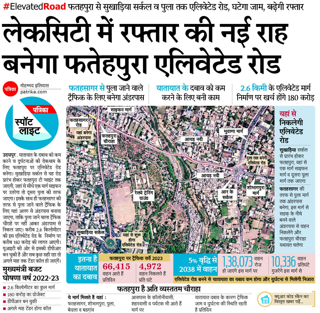 उदयपुर . यातायात के दबाव काे कम करने व दुर्घटनाओं की रोकथाम के लिए फतहपुरा पर एलिवेटेड रोड बनेगा। सुखाडिय़ा सर्कल से यह रोड प्रारंभ होकर फतहपुरा टी प्वाइंट तक जाएगी, जहां से सीधे एक मार्ग साइफन पर उतरेगा तो दूसरा पुला की तरफ जाएगा। इसके साथ ही फतहसागर की तरफ से पुला जाने वाले ट्रैफिक के लिए यहां अलग से अंडरपास बनाया जाएगा, ताकि पुला जाने वाला ट्रैफिक चौराहे पर नहीं आकर अंडरपास से निकल जाए। करीब 2.6 किलोमीटर की इस एलिवेटेड रोड के निर्माण पर करीब 180 करोड़ की लागत आएगी। यूआइटी की ओर से इसकी डीपीआर बन चुकी है और सब कुछ सही रहा तो अगले माह तक टेंडर कॉल हो जाएंगेें।
