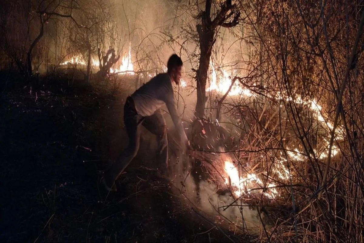बड़ी िस्थत पाड़वा की पहाड़ी पर आग बुझाता ग्रामीण।