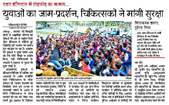 दूसरी ओर आईएमए अध्यक्ष डॉ. सुनील चुघ, महासचिव डॉ. आनंद गुप्ता, आरएमसीटी महासचिव डॉ. राहुल जैन, अरिस्दा के डॉ. तरुण व्यास, रेजिडेंट यूनियन अध्यक्ष डॉ. राजवीरसिंह एवं महासचिव डॉ. दीपाराम पटेल ने सामूहिक ज्ञापन देकर कलक्टर से तोडफ़ोड में लिप्त आरोपितों को मेडिकल प्रोटक्शन एक्ट २००८ के तहत शीघ्र गिरफ्तार करने की बात कही। समुचित लॉ एंड ऑर्डर बनाए रखते हुए चिकित्सकों को सुरक्षा मुहैया कराने की मांग दोहराई।