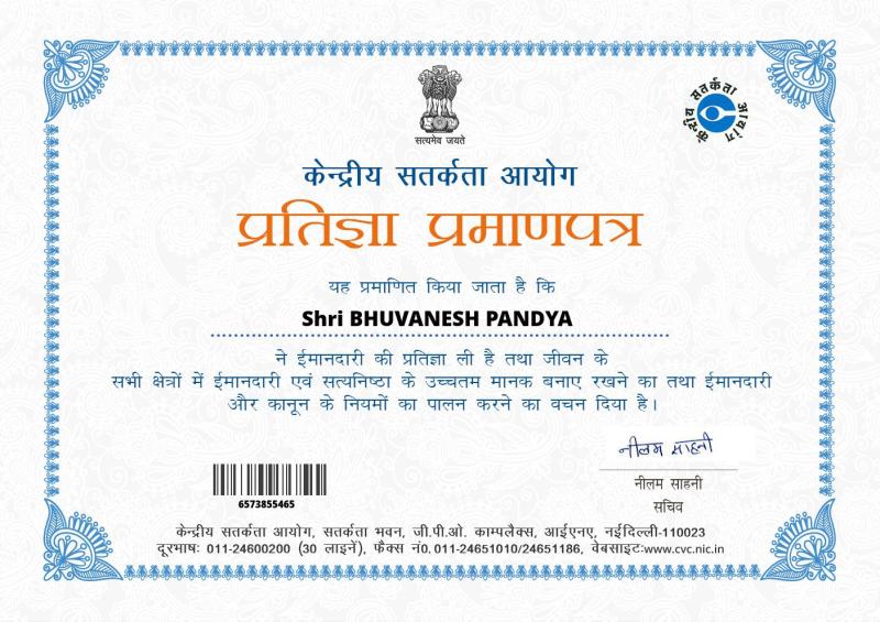 - प्रमाण पत्र बकायदा केन्द्रीय सतर्कता आयोग की सचिव नीलम साहनी के हस्ताक्षर से जारी हो रहा है।