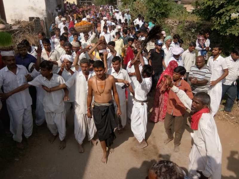 गाैैैतम पटेल/ सराडा. नौ दिन शक्ति उपासना के साथ रुद्रअवतार भगवान कालभैरव अपने लावलश्कर व सैकडों की जनमेदिनी के साथ सरवर पहंंचे। मंगलवार रात्रिजागरण में डीजे की धार्मिक धुुनों पर पूूरी रात दादा के भक्तों ने जमकर थिरकने के आनन्द लिया । जागरण में हुई कालभैरव की चौकी में भाेपा रमेश पटेल ने लोगों को उनकी समस्याओं के निराकरण के उपाय बताते हुए अपने अपने ईष्ट पर पूर्ण विश्वास के साथ निश्छल भक्ति और का सन्देश दिया। बुधवार प्रात: सवा पांच बजे पूर्णाहूति के साथ महाआरती की गई । इसके पश्चात बाबा काल भैरव की भावपूर्ण पूजा -अर्चना कर सवा नौ बजे बाबा के भोपा रमेश पटेल काले रंग की लंगोट पहकर घूंघरु कमर में घूंघरु पहने हाथ में तलवार व सांकल लिये पूर्ण बाबा काल भैरव के रुप में सरवर जवारा विसर्जन के लिए निकले । डीजे की धार्मिक भक्ति धुुनों व ढोल पर काल भैरव का लवाजमा जिनमें मालिक दादा ,गोराजी,आशापुरा माता,जावरमाता,चौथ माता,दशामाता,गातोडजी, खांकदेव, भूमिया,छोटे-मोटे पूर्वज भी अपने अपने भोपो को चौकी के रुप में साथ चल रहे थे । महिलाओं के मंगलगीत गान के बीच विशाल जनमेदिनी देवी देवताओं के जयकारोंं के साथ पूूूरी शोभायात्रा काल भैरव मन्दिर से आशापुरा माता जी मन्दिर पहूुुची जहां धोक लगने व हनुमानजी मन्दिर ,राठोड बावजी व आमलीवाले भोमिया जी पहूंची जहां नमन कर श्रीफल भेंंट किया। डीजे की धुुन पर भक्तिगीतों पर नाचते थिरकते श्रद्धालुओं व देवी देवताओं की चौकी के साथ भोपोंं का नृत्य बड़़ा़ा अलौकिक दृश्य लग रहा था एेेसा प्रतीत हो रहा था मानो भगवान भूतनाथ शिवजी की बारात जा रही हो। सरवर के माग में काल भैरव ने चिता की भस्म का श्रंगार किया जिसमें नीचे बिछावन डालकर चौकी में भोपा जी बैठे जिन पर कपडे गांठ से चिताभस्म गिराई गई । भस्म श्रंगार के बाद कुछ देर भस्म में लाैैटने ने बाद सरवर यात्रा हरचन्द तालाब पहुुंची । काल भैर व की चौकी में उनके उपर गिरती चिता की भस्म ने मौजूद श्रद्धालुओं को खुद भगवान शिव के भस्म स्नान के अलौकिक दर्शन का अहसास करा दिया।