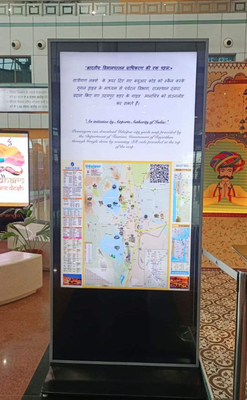 उदयपुर एयरपोर्ट ने अराइवल पॉइंट पर साइन बोर्ड लगवाया है। जिसमें क्यूआर कोड स्कैन करना होगा और पूरे शहर की जानकारी पर्यटकों के हाथों में होगी। उदयपुर में आते ही पर्यटक सबसे पहले पर्यटन स्थलों की ही जानकारी चाहता है और जब इस रूप में उनके पास फर्स्ट इंफॉर्मेशन अवेलेबल होगी तो टूरिस्ट्स को कहीं भटकना नहीं होगा। ये एयरपोर्ट निदेशक योगेश नगाइच की अच्छी पहल है। शहर में भी ऐसे ही साइनेजेज की जरूरत है।