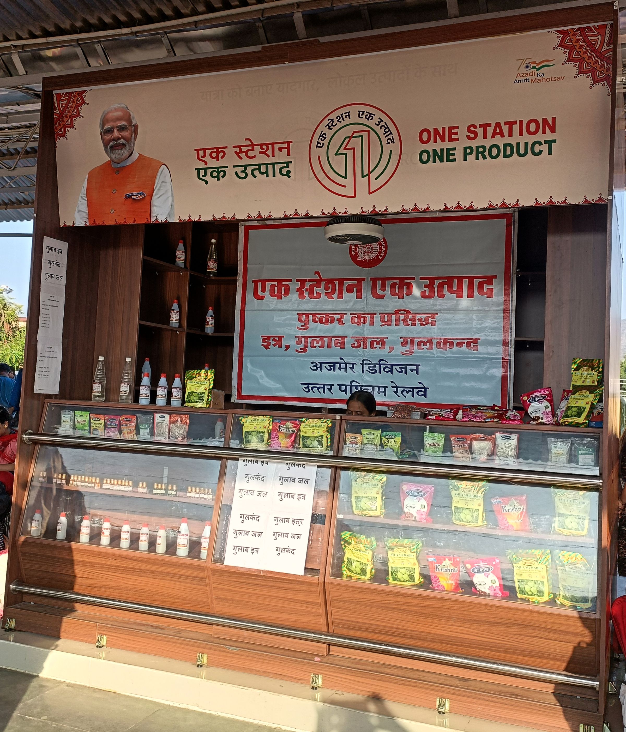 योजना के तहत अजमेर मंडल के विभिन्न स्टेशनों पर गुलाब जल, गुलकंद, पिछोई चित्रकारी मेहंदी, मिठाई चॉकलेट, मिर्ची का अचार, हस्तकला के आइटम्स, बर-बांस उत्पाद /मिर्चीबड़ा, लकड़ी के खिलौने, कचोरी, मिट्टी के बर्तन, कपड़ा उत्पाद, पापड़, फास्ट फूड आइटम्स, कढ़ाई आइटम, मार्बल उत्पाद, छाते, कृत्रिम आभूषण, सजावटी आइटम, आम का अचार, बेकरी उत्पाद, पापड़ भुजिया, हस्तशिल्प/लकड़ी के खिलौने, चमड़े की जूतियां, पेंटिंग आदि की बिक्री की जा सकती है।