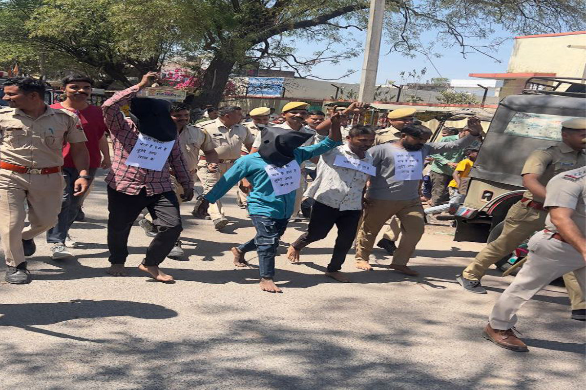 राजस्थान के उदयपुर के कोटड़ा कस्बे में व्यापारी के साथ लूट करने वाले आरोपियों की कोटड़ा सीआई रामरूप मीणा की मौजूदगी में पुलिस ने सोमवार को भरे बाजार में परेड करवाई। जहां आरोपियों के हाथों में हथकड़ी, आधा सिर गंजा कर बापर्दा और गले में चोरी करना पाप है, हम हैं लुटेरे आठ लाख के… की तख्तियां लगाकर सार्वजनिक स्थानों पर घुमाया गया।