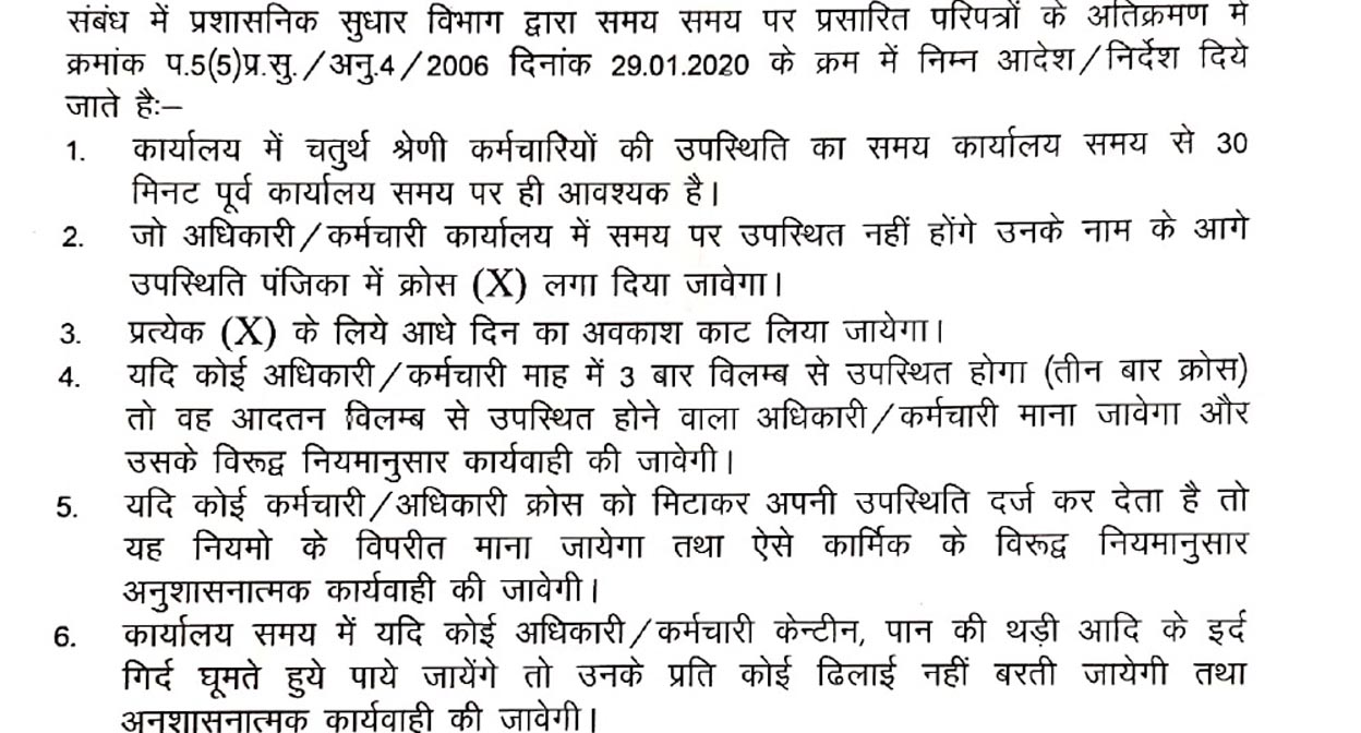 - जो अधिकारी-कर्मचारी कार्यालय में समय पर उपस्थित नहीं होंगे उनके नाम के आगे क्रोस लगा दिया जाएगा