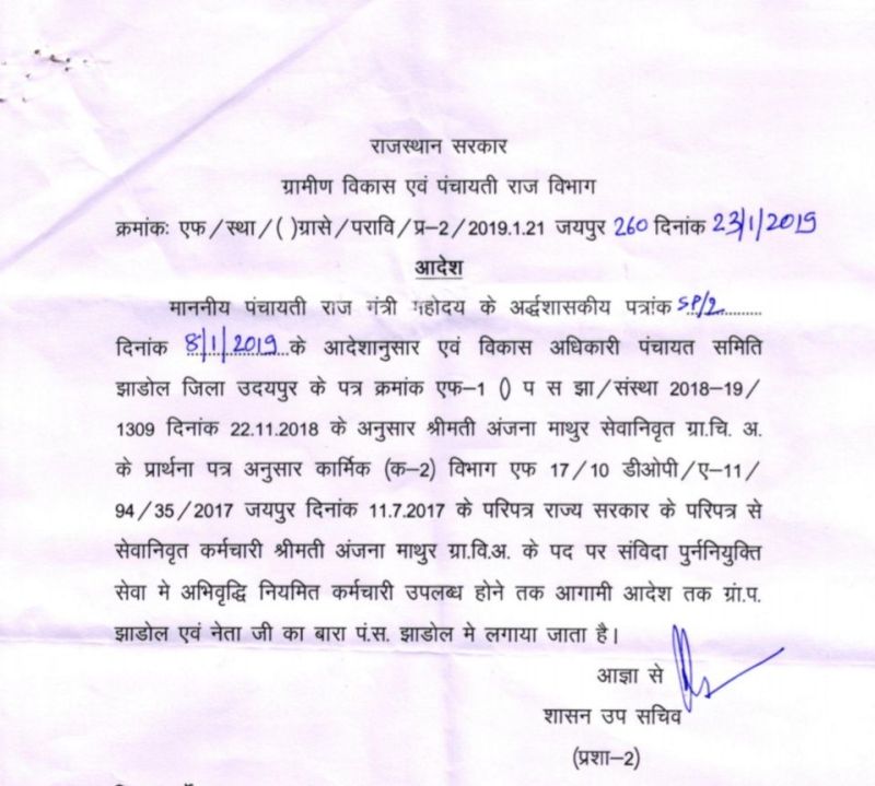 हुआ ऐसे कि 23 जनवरी 2019 को ग्रामीण विकास एवं पंचायतीराज विभाग का आदेश क्रमांक 260 जारी हुआ जिसमें सेवानिवृत अंजना माथुर को नियमित कर्मचारी उपलब्ध होने तक आगामी आदेशों तक उदयपुर जिले की झाड़ोल पंचायत समिति के ग्राम पंचायत झाड़ोल व नेताजी का बारा में संविदा ग्राम विकास अधिकारी के पद पर लगाया जाता है। आदेश शासन उप सचिव (प्रशा-2) के नाम से जारी किया गया।