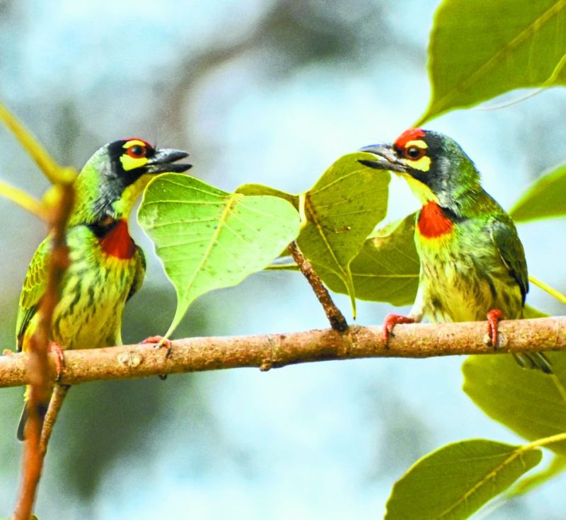 मेनार. (उदयपुर). बर्ड विलेज मेनार में इन दिनों ठठेरा पक्षी की चहचहाहट सुनाई देने लगी है। यह पक्षी कई जगहों पर भी दिखाई भी दे रहा है। इस पक्षी की आवाज टुक-टुक सी आती है। जैसे हथौड़े से तांबे के पात्र पर चोट की जा रही हो। अंग्रेजी में इसे कॉपरस्मिथ बारवेट के नाम से जाना जाता है। इसे बसंता भी कहते हैं। अक्सर ये घरों के बाहर छोटे मोटे पेड़ो , झाडिय़ों पर भी दिखाई देता है। ये छोटा पक्षी है जिसकी लम्बाई 17 सेमी तक होती है। ये गौरेया से बड़ा दिखने वाला ये पक्षी हरे रंग का होता है। ये पेड़ की ऊंची डाल पर बैठकर आवाज करता है। इस पक्षी का नाम कॉपरस्मिथ बारबेट जिसे ठठेरा बसंता पक्षी भी कहते है। इसका वेज्ञानिक नाम सिलिपोगोन हैमसेफालस है जो हैमसेफालस प्रजाति का है वही इसका परिवार मेगालाईमिडा जो कोर्डेटा जाति का है। कॉपरस्मिथ बारबेट पक्षी लगभग पूरे भारत में पाया जाता है वही हिमालय पर ये 1000 मीटर की ऊँचाई तक मिलता है।
