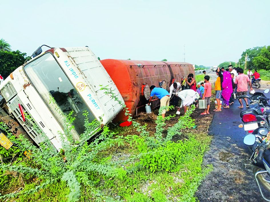 हाइवे पर टैंकर पलटा, तेल लूटने की मच गई होड़