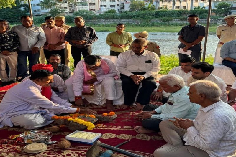 आयड़ नदी पर फेंसिंग कार्य का पूजा- अर्चना कर शुभारंभ करते पंजाब के राज्यपाल गुलाबचंद कटारिया सहित अन्य अतिथि।
