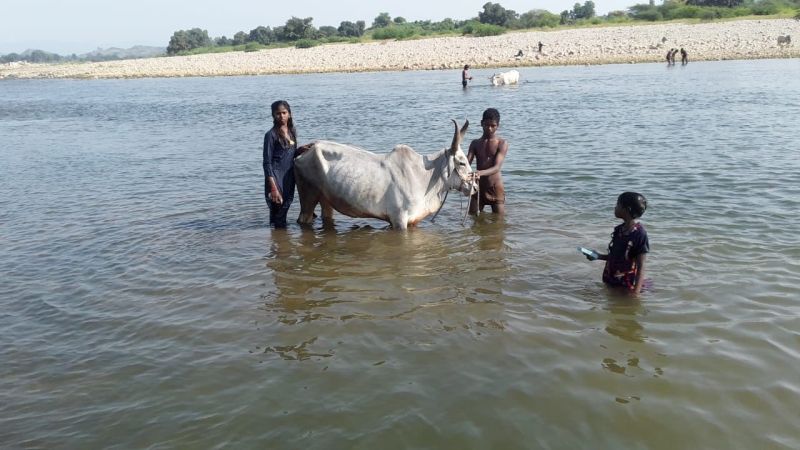 नदी पर गाय को स्नान कराते हुए।