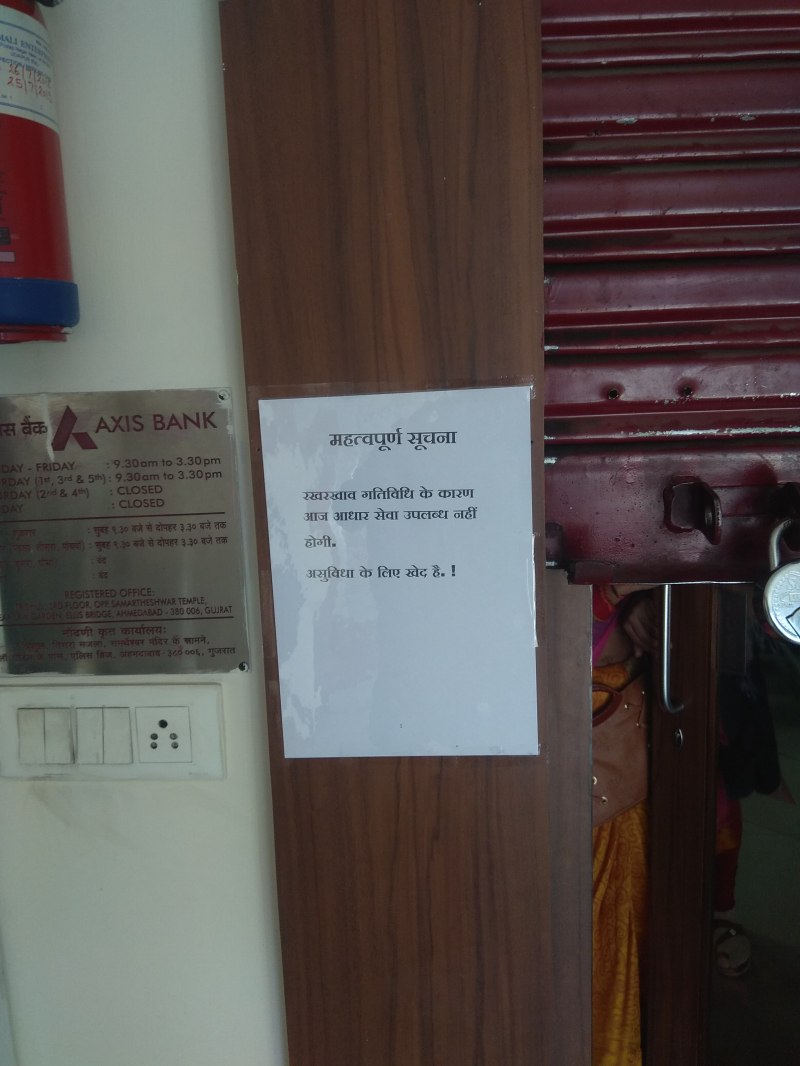 शहर की वनिता शर्मा ने बताया कि वह आधार कार्ड बनवाने के लिए दुर्गा नर्सरी स्थित एक निजी बैंक में गई, जहां 'रखरखाव कार्य के चलते आज आधार सेवा उपलब्ध नहीं होगीÓ की चिट लगा रखी थी। बैंककर्मियों से कारण पूछने पर उन्होंने बताया कि सर्वर कनेक्ट नहीं हो रहा है। बाद में वह चेटक स्थित निजी बैंक में गई, वहां भी इसी तरह का बहाना बनाकर उसे लौटा दिया गया।