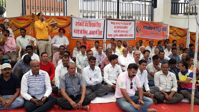 उदयपुर . राजस्थान उच्च न्यायालय की मांग को लेकर चल रहा धरना शनिवार को छुट्टी के बावजूद जारी रहा। आज बड़ी संख्या में भारतीय जनता पार्टी से संबंधित भारतीय मजदूर संघ और इससे जुड़े विभिन्न फैक्ट्री में काम करने वाले मजदूर संगठनों के सैकड़ों कार्यकर्ताओं ने धरने पर बैठ कर मांग का समर्थन किया । अल सुबह से ही सभी भामस से जुड़े कार्यकर्ता व पदाधिकारी जिला न्यायालय परिसर के बाहर एकत्रित होने लगे । धीरे-धीरे देखते ही देखते यह संख्या सैकड़ों में तब्दील हो गई । धरने का नेतृत्व भारतीय मजदूर संघ के नेता और प्रदेश उपाध्यक्ष अमर सिंह सांखला ने किया ।
