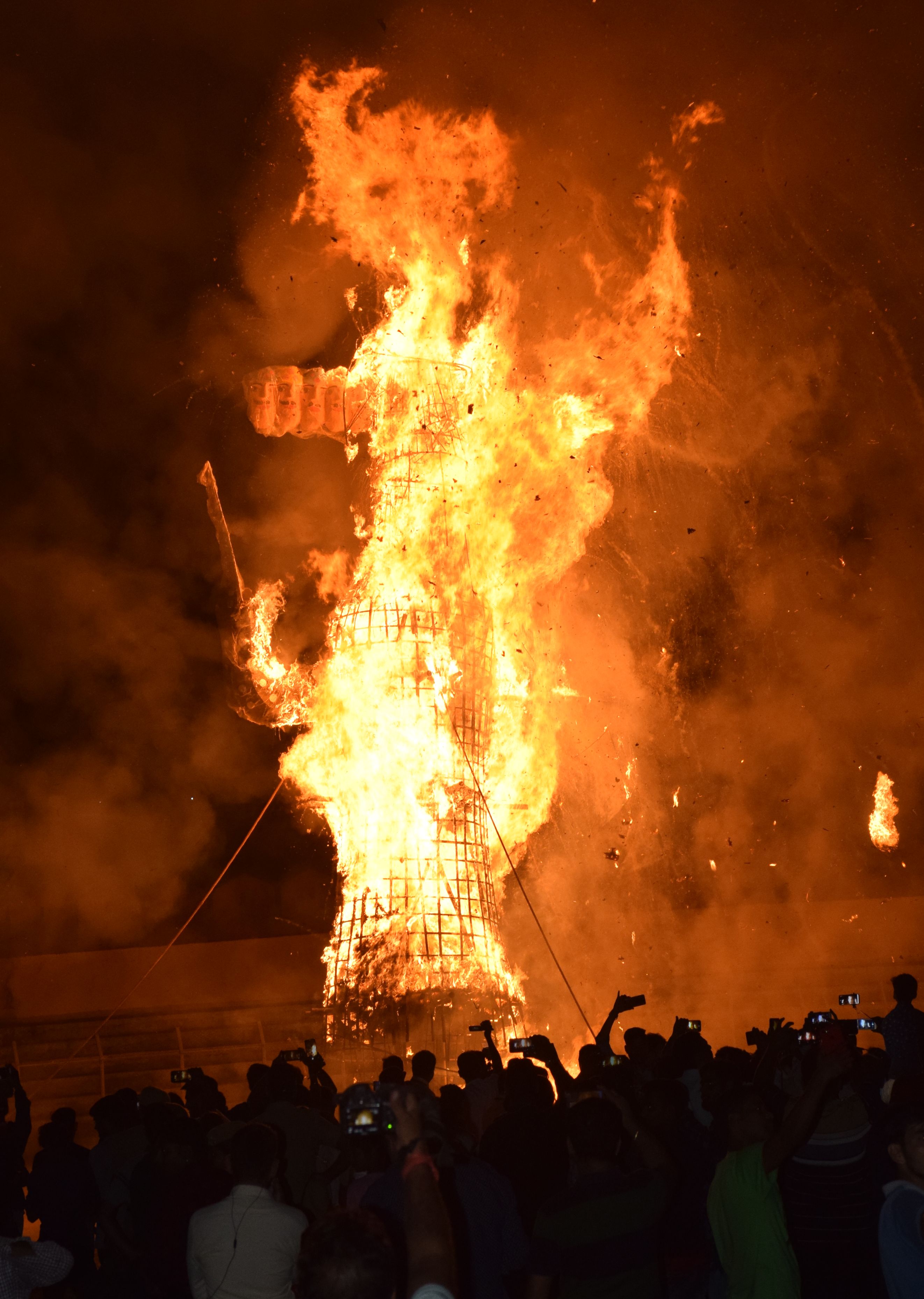 फि र कुंभकर्ण के पुतले जल उठे। इसके बाद राम ने तीर चलाया और रावण की नाभी पर दे मारा, जिससे रावण जल उठा और फि र जलने लगा। दम्भी रावण को जलने में देर लगी और धीरे-धीरे जला, लेकिन आखिर बुराई का अंत हुआ। रावण का पुतला आग के हवाले हो गया। इससे पहले रावण की आंखों से निकली चिंगारियों से आक्रोश झलक रहा था। बाद में वह जल कर रख हुआ।