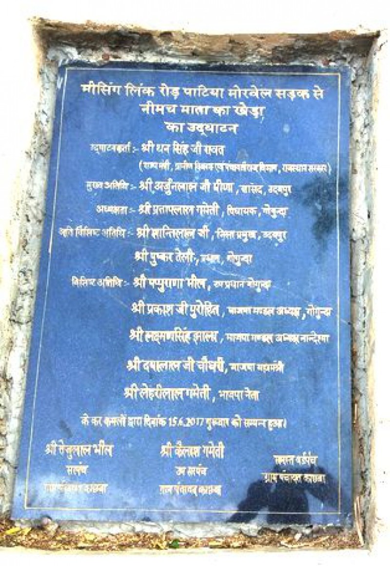 उक्त सडक़ का लोकार्पण 15 जून 2017 को ग्रामीण विकास एवं पंचायती राज विभाग के राज्यमंत्री धनसिंह रावत ने सांसद अर्जुनलाल मीणा एवं विधायक प्रतापलाल गमेती की उपस्थिति में किया था। ग्राम पंचायत क्षेत्र से होकर गुजर रही करीब चार किलोमीटर लंबी मिङ्क्षसग लिंक रोड पर निर्माण की लागत का सूचना पट्ट नहीं लगाया गया है। आनन-फानन में सडक़ के उद्घाटन के बाद उद्घाटन पट्टिका यहां जमीन और कच्ची दीवार के सहारे खड़ी हुई है। कोने पर लगी यह पट्टिका कर्व पर मुड़ते वाहनों के लिए भी दुविधाजनक बनी हुई है।
