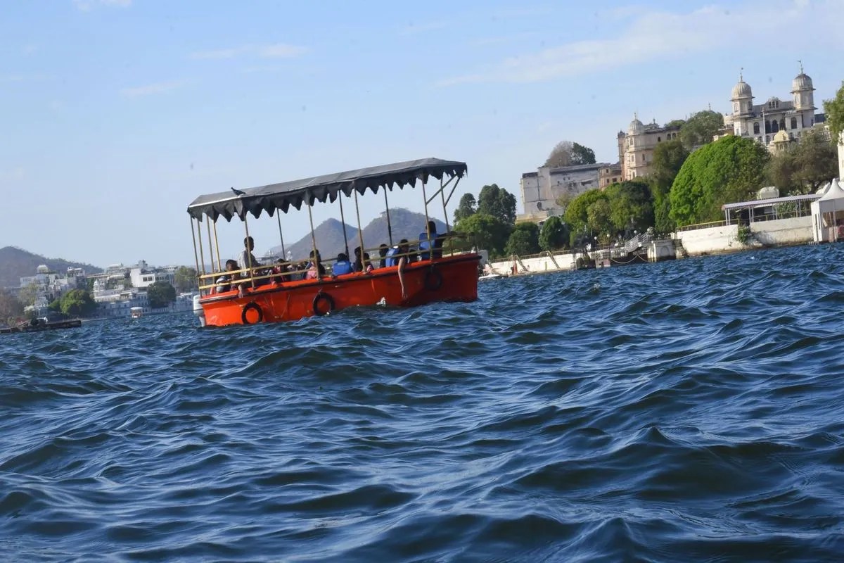 लहरों के बीच नाव की सवारी का रोमांच लेते पर्यटक।