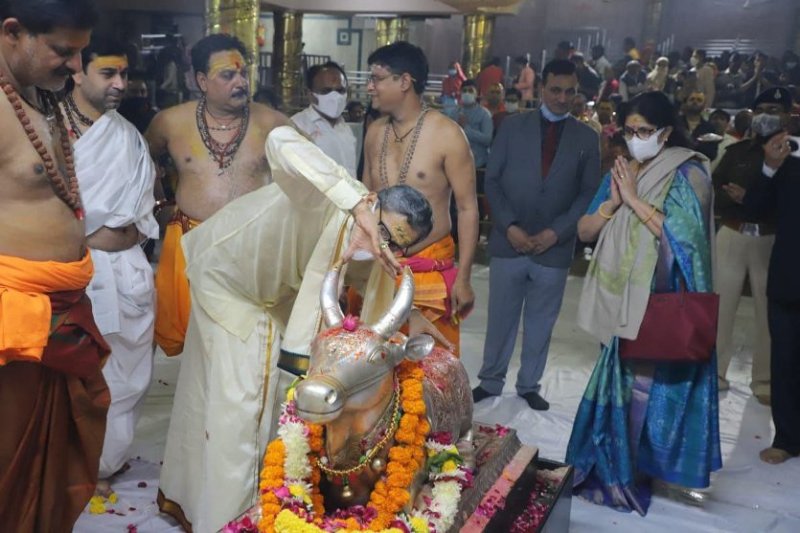 नंदी दरअसल धर्म के प्रतीक हैं और मान्यता है कि नंदी के दोनों सींअ पर हाथ रखकर इस तरह दर्शन करने से महाकाल के पूर्ण दर्शन हो जाते हैं। यहां से वे महाकाल मंदिर के मुख्य पुजारी पं. घनश्याम शर्मा के आश्रम पर पहुंचे। इसके बाद वे शिप्रा तट पहुंचे जहां पूर्णिमा के अवसर पर उन्होंने परिवार के साथ रामघाट पर शिप्रा नदी में दीपदान भी किया। इसके बाद वे इंदौर के लिए रवाना हो गए।