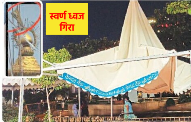Golden flag - एमपी के उज्जैन के महाकाल लोेक में बड़ा हादसा हुआ है। यहां के विश्व प्रसिद्ध मंदिर का शिखर का स्वर्ण ध्वज गिर गया है। रविवार दोपहर अचानक महाकाल मंदिर परिसर में यह अप्रत्याशित घटना घटित हुई। करीब 16 किलोमीटर प्रति घंटे की रफ्तार से चली हवा से महाकालेश्वर मंदिर के शिखर पर स्थापित स्वर्ण ध्वज अचानक नीचे गिर गया। सौभाग्यवश इस घटना में कोई जनहानि नहीं हुई। स्वर्ण शिखर को वापस स्थापित करने का कार्य भी शुरू हो गया है। महाकाल लोक में लगाए गए कई डेकोरेटिव शेड और केनोपी भी फट गए और उड़ने लगे थे। इस हादसे ने मंदिर प्रशासन की सतर्कता और संरचनात्मक व्यवस्था पर सवाल खड़े कर दिए हैं। इससे महाकाल लोक की सुरक्षा और निर्माण गुणवत्ता को लेकर भी सवाल उठ रहे हैं।