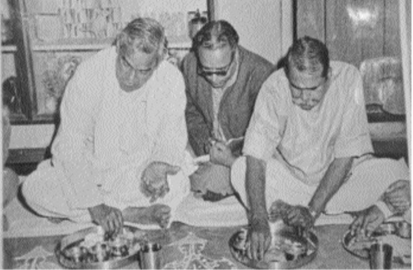 1977 में तत्कालीन सांसद हुकमचंद कछवाय के बहादुरगंज स्थित निवास पर दाल-बाफल-लड्डू का आनंद लेते अटल बिहारी वाजपेयी। यह दुर्लभ फोटो हुकमचंद के पुत्र भूपेंद्र कछवाय ने पत्रिका को उपलब्ध कराया है।