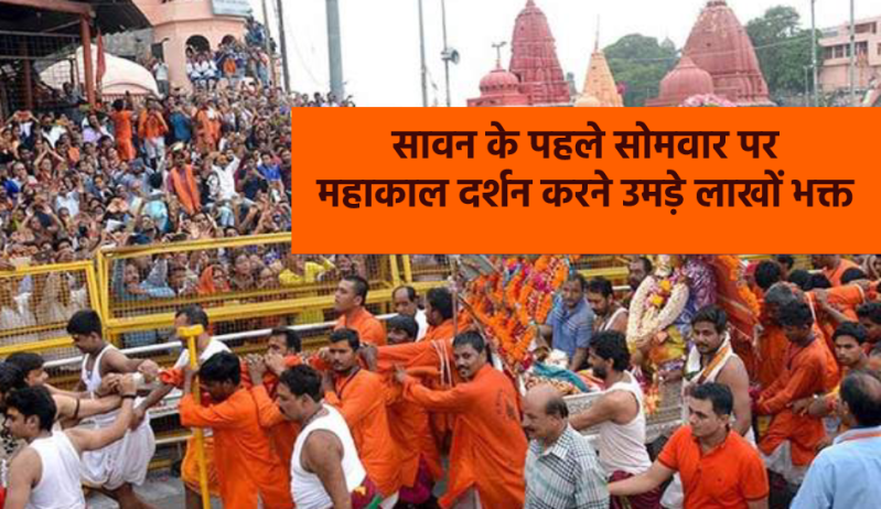 उज्जैन. सावन के पहले सोमवार पर बाबा महाकाल की नगरी में भक्तों का सैलाब उमड़ पड़ा है। 10 जुलाई को रात 2.30 बजे पट खोल दिए गए थे और तभी से भक्तों ने महाकाल के दर्शन शुरु कर दिए। बताया जा रहा है कि अभी तक करीब डेढ़ लाख लोग दर्शन कर चुके हैं। महाकाल मंदिर में अभी भी भक्तों की लंबी कतार लगी है। इधर आज ही महाकाल की पहली सवारी भी निकाली जा रही है। सवारी मार्ग में सुरक्षा की दृष्टि से चाक-चौबंद व्यवस्था की गई है।