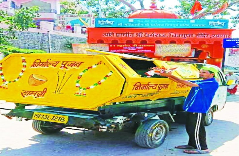उज्जैन. कचरा वाहन में धार्मिक पूजन सामग्री (निर्माल्य) उठवाने के चलते अब लोगों की आस्था आहत नहीं होगी। नगर निगम ने निर्माल्य सामग्री के लिए दो विशेष तरह के वाहन तैयार किए हैं। पीले रंग के इन मिनी टीपर वाहनों को प्रमुख मंदिर क्षेत्रों नियमिति रूप से चलाया जा रहा है। इन्हीं के जरिए निर्माल्य सामग्री एकत्रित कर निष्पादन के लिए भेजी जा रही है। यदि शहर में कहीं धार्मिक स्थल या आयोजन में इन्हें बुलाया जाता है तो वहां भी ये वाहन पहुंचकर निर्माल्य एकत्रित करेंगे। यह पहली बार है जब निगम ने धार्मिक सामग्री उठवाने के लिए इस तरह के वाहनों की व्यवस्था की है।