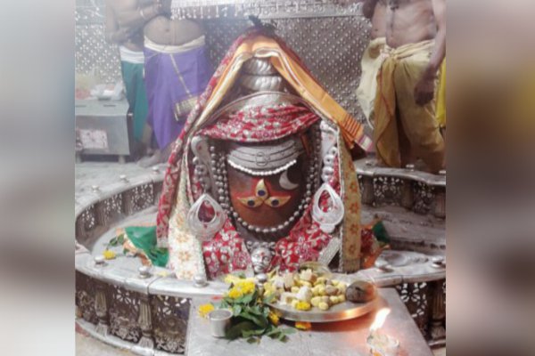 गले में पुष्पों का हार सुशोभित था, तो त्रिपुंड व त्रिनेत्र से मुखारविंद दमक रहा था। भोलेनाथ को जल-दूध, दही और चंदन से स्नान के बाद पंचामृत पूजन किया गया। राजाधिराज महाकाल का मनभावन शृंगार हुआ। ज्योतिर्लिंग पर चंदन से आकर्षक स्वरूप बनाया गया, भक्तों ने इस निराले रूप के दर्शन किए तो पूरा हॉल जयकारों से गूंज उठा।