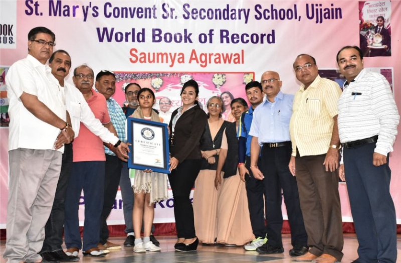 उज्जैन। अंतरराष्ट्रीय जम्प रोप खिलाड़ी एकलव्य अवार्डी उज्जैन की सौम्या अग्रवाल ने जंप रोप, डबल अंडर रोप में एक मिनट में 170 रोप करके वल्र्ड बुक ऑफ रिकॉर्ड में अपना नाम दर्ज कराया। वल्र्ड बुक ऑफ रिकॉर्ड की ओर से सुरभि कौर द्वारा डिक्लेयर कर प्रमाण पत्र सौंपा गया। दो वर्ष पूर्व 1 फ रवरी 2016 को सौम्या जम्प रोप में अपना नाम गोल्डन बुक ऑफ वल्र्ड रिकॉर्ड में दर्ज करा चुकी हैं।
