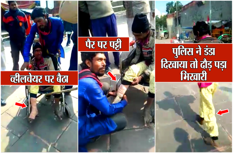 संदिग्ध परिस्थिति में दोनों को घूमते देख पुलिस ने इन्हें रामघाट पर रोका और पूछताछ की। इस बीच पुलिस को पता चला कि यह नकली भिखारी है। व्हीलचेयर पर जो बैठा हुआ है वह लंगड़ा नहीं है। इस पर पुलिस ने डंडा दिखाकर उसका पट्टा खुलवाया। युवक ने लोगों के सामने ही पैर का पट्टा खोला। पुलिस ने उससे कहा अब उठ तो वह खड़ा हो गया।