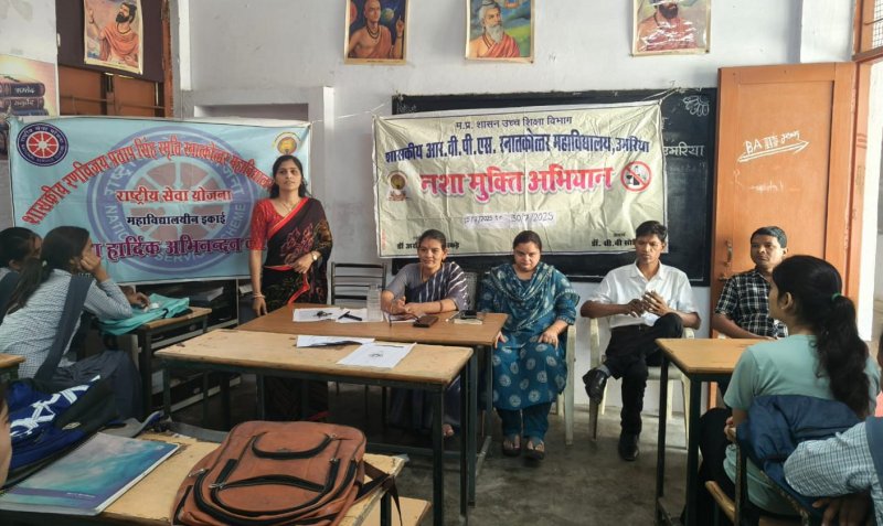प्रधानमंत्री कॉलेज ऑफ एक्सीलेंस शासकीय महाविद्यालय उमरिया में स्थापित राष्ट्रीय सेवा योजना (रासेयो) द्वारा नशे से दूरी है जरूरी अभियान के अंतर्गत एक विशेष जागरूकता कार्यक्रम का आयोजन किया गया। यह अभियान मध्यप्रदेश शासन उच्च शिक्षा विभाग, भोपाल के निर्देशानुसार चलाया जा रहा है, जिसका उद्देश्य युवाओं एवं नागरिकों को मादक पदार्थों के दुष्प्रभावों से अवगत कराना तथा नशे की लत से दूर रहने के लिए प्रेरित करना है।