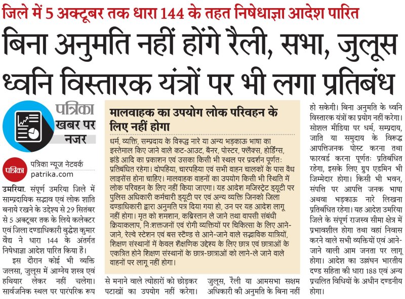 उमरिया. संपूर्ण उमरिया जिले में साम्प्रदायिक सद्भाव एवं लोक शांति बनाये रखने के उद्देश्य से 29 सितंबर से 5 अक्टूबर तक के लिये कलेक्टर एवं जिला दण्डाधिकारी बुद्धेश कुमार वैद्य ने धारा 144 के अंतर्गत निषेधाज्ञा आदेश पारित किया है। इस दौरान कोई भी व्यक्ति जलसा, जुलूस में आग्नेय शस्त्र एवं हथियार लेकर नहीं चलेगा। सार्वजनिक स्थल पर पारंपरिक रूप से मनाने वाले त्योहारों को छोड़कर पटाखों का उपयोग नहीं करेगा। जुलूस, रैली या आमसभा सक्षम अधिकारी की अनुमति के बिना नहीं हो सकेगी। बिना अनुमति के ध्वनि विस्तारक यंत्रों का प्रयोग नहीं करेगा। सोशल मीडिया पर धर्म, सम्प्रदाय, जाति या समुदाय के विरूद्ध आपत्तिजनक पोस्ट करना तथा फारवर्ड करना पूर्णत: प्रतिबंधित रहेगा, इसके लिए गु्रप एडमिन भी जिम्मेदार होगा। किसी भी भवन, संपत्ति पर आपत्ति जनक भाषा अथवा भड़काऊ नारे लिखना प्रतिबंधित रहेगा। यह आदेश उमरिया जिले के संपूर्ण राजस्व सीमा क्षेत्र में प्रभावशील होगा तथा वहां निवास करने वाले सभी व्यक्तियों एवं आने-जाने वाली आम जनता पर लागू होगा। आदेश का उल्लंघन भारतीय दण्ड सहिता की धारा 188 एवं अन्य प्रचलित विधियों के अधीन दण्डनीय होगा। मालवाहक का उपयोग लोक परिवहन के लिए नहीं होगा धर्म, व्यक्ति, सम्प्रदाय के विारुद्ध नारे या अन्य भड़काऊ भाषा का इस्तेमाल किए जाने वाले कट-आउट, बैनर, पोस्टर, फ्लैक्स, होर्डिंग्स, झंडे आदि का प्रकाशन एवं उसका किसी भी स्थल पर प्रदर्शन पूर्णत: प्रतिबंधित रहेगा। दोपहिया, चारपहिया एवं सभी वाहन चालकों के पास वैध लाइसेंस होना चाहिए। मालवाहक वाहनों का उपयोग किसी भी स्थिति में लोक परिवहन के लिए नहीं किया जाएगा। यह आदेश मजिस्ट्रेट ड्यूटी पर पुलिस अधिकारी कर्मचारी ड्यूटी पर एवं अन्य व्यक्ति जिनको जिला दण्डाधिकारी द्वारा अनुमति पत्र दिया गया हो, उन पर यह आदेश लागू नहीं होगा। मृत को शमशान, कब्रिस्तान ले जाने तथा वापसी संबंधी क्रियाकलाप, नि:शक्तजनों एवं रोगी व्यक्तियों पर चिकित्सा के लिए आने-जाने, रेल्वे स्टेशन एवं बस स्टैण्ड से आने-जाने वाले सद्भाविक यात्रियों, शिक्षण संस्थानों में केवल शैक्षणिक उद्देश्य के लिए छात्र एवं छात्राओं के एकत्रित होने शिक्षण संस्थानों के छात्र-छात्राओं को लाने-ले जाने वाले वाहनों पर लागू नहीं होगा।
