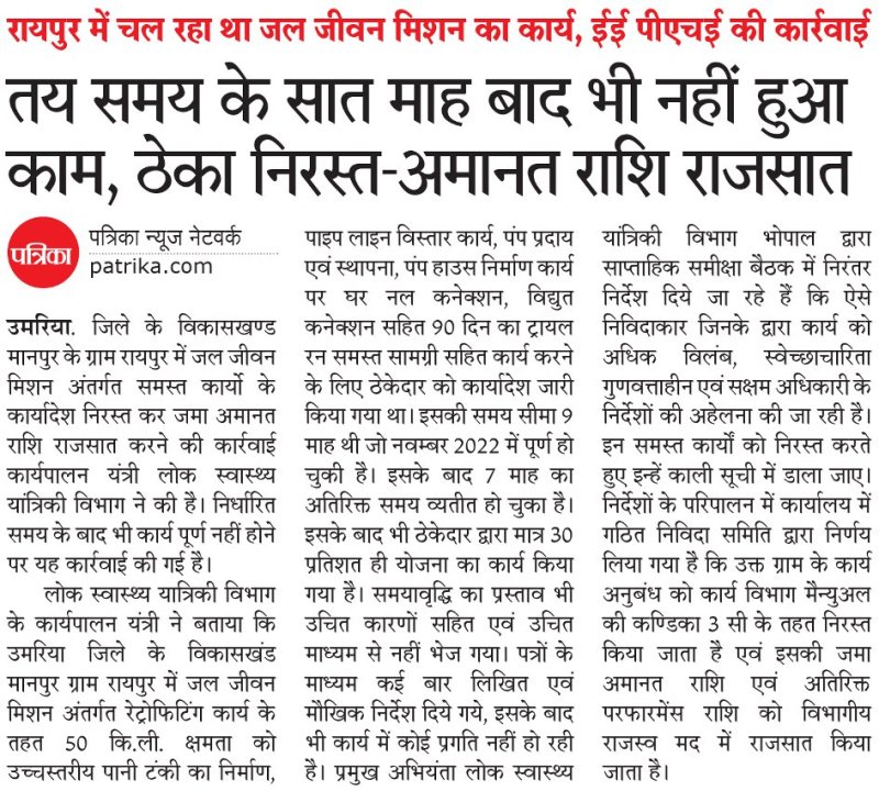 लोक स्वास्थ्य यात्रिकी विभाग के कार्यपालन यंत्री ने बताया कि उमरिया जिले के विकासखंड मानपुर ग्राम रायपुर में जल जीवन मिशन अंतर्गत रेट्रोफिटिंग कार्य के तहत 50 कि.ली. क्षमता को उच्चस्तरीय पानी टंकी का निर्माण, पाइप लाइन विस्तार कार्य, पंप प्रदाय एवं स्थापना, पंप हाउस निर्माण कार्य पर घर नल कनेक्शन, विद्युत कनेक्शन सहित 90 दिन का ट्रायल रन समस्त सामग्री सहित कार्य करने के लिए ठेकेदार को कार्यादेश जारी किया गया था। इसकी समय सीमा 9 माह थी जो नवम्बर 2022 में पूर्ण हो चुकी है। इसके बाद 7 माह का अतिरिक्त समय व्यतीत हो चुका है। इसके बाद भी ठेकेदार द्वारा मात्र 30 प्रतिशत ही योजना का कार्य किया गया है। समयावृद्धि का प्रस्ताव भी उचित कारणों सहित एवं उचित माध्यम से नहीं भेज गया। पत्रों के माध्यम कई बार लिखित एवं मौखिक निर्देश दिये गये, इसके बाद भी कार्य में कोई प्रगति नहीं हो रही है। प्रमुख अभियंता लोक स्वास्थ्य यांत्रिकी विभाग भोपाल द्वारा साप्ताहिक समीक्षा बैठक में निरंतर निर्देश दिये जा रहे हैं कि ऐसे निविदाकार जिनके द्वारा कार्य को अधिक विलंब, स्वेच्छाचारिता गुणवत्ताहीन एवं सक्षम अधिकारी के निर्देशों की अहेलना की जा रही है। इन समस्त कार्यों को निरस्त करते हुए इन्हें काली सूची में डाला जाए। निर्देशों के परिपालन में कार्यालय में गठित निविदा समिति द्वारा निर्णय लिया गया है कि उक्त ग्राम के कार्य अनुबंध को कार्य विभाग मैन्युअल की कण्डिका 3 सी के तहत निरस्त किया जाता है एवं इसकी जमा अमानत राशि एवं अतिरिक्त परफारमेंस राशि को विभागीय राजस्व मद में राजसात किया जाता है।