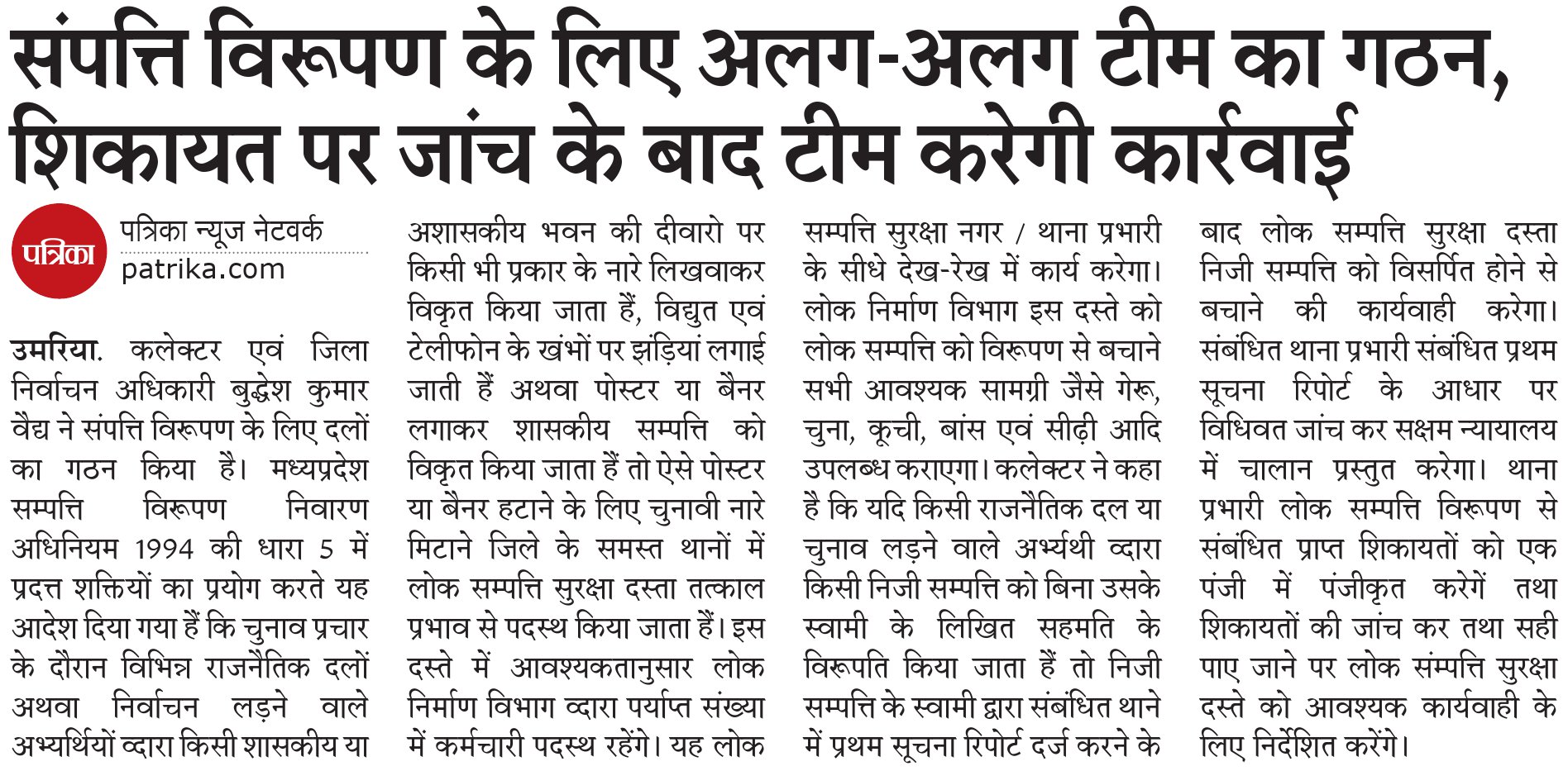 उमरिया. कलेक्टर एवं जिला निर्वाचन अधिकारी बुद्धेश कुमार वैद्य ने संपत्ति विरूपण के लिए दलों का गठन किया है। मध्यप्रदेश सम्पत्ति विरूपण निवारण अधिनियम 1994 की धारा 5 में प्रदत्त शक्तियों का प्रयोग करते यह आदेश दिया गया हैं कि चुनाव प्रचार के दौरान विभिन्न राजनीतिक दलों अथवा निर्वाचन लडऩे वाले अभ्यर्थियों व्दारा किसी शासकीय या अशासकीय भवन की दीवारों पर किसी भी प्रकार के नारे लिखवाकर विकृत किया जाता हैं, विद्युत एवं टेलीफोन के खंभों पर झंडिय़ां लगाई जाती हैं अथवा पोस्टर या बैनर लगाकर शासकीय सम्पत्ति को विकृत किया जाता हैं तो ऐसे पोस्टर या बैनर हटाने के लिए चुनावी नारे मिटाने जिले के समस्त थानों में लोक सम्पत्ति सुरक्षा दस्ता तत्काल प्रभाव से पदस्थ किया जाता हैं। इस दस्ते में आवश्यकतानुसार लोक निर्माण विभाग व्दारा पर्याप्त संख्या में कर्मचारी पदस्थ रहेंगे। यह लोक सम्पत्ति सुरक्षा नगर / थाना प्रभारी के सीधे देख-रेख में कार्य करेगा। लोक निर्माण विभाग इस दस्ते को लोक सम्पत्ति को विरूपण से बचाने सभी आवश्यक सामग्री जैसे गेरू, चुना, कूची, बांस एवं सीढ़ी आदि उपलब्ध कराएगा। कलेक्टर ने कहा है कि यदि किसी राजनैतिक दल या चुनाव लडऩे वाले अभ्र्यथी व्दारा किसी निजी सम्पत्ति को बिना उसके स्वामी के लिखित सहमति के विरूपति किया जाता हैं तो निजी सम्पत्ति के स्वामी द्वारा संबंधित थाने में प्रथम सूचना रिपोर्ट दर्ज करने के बाद लोक सम्पत्ति सुरक्षा दस्ता निजी सम्पत्ति को विसर्पित होने से बचाने की कार्यवाही करेगा। संबंधित थाना प्रभारी संबंधित प्रथम सूचना रिपोर्ट के आधार पर विधिवत जांच कर सक्षम न्यायालय में चालान प्रस्तुत करेगा। थाना प्रभारी लोक सम्पत्ति विरूपण से संबंधित प्राप्त शिकायतों को एक पंजी में पंजीकृत करेगें तथा शिकायतों की जांच कर तथा सही पाए जाने पर लोक संम्पत्ति सुरक्षा दस्ते को आवश्यक कार्यवाही के लिए निर्देशित करेंगे।