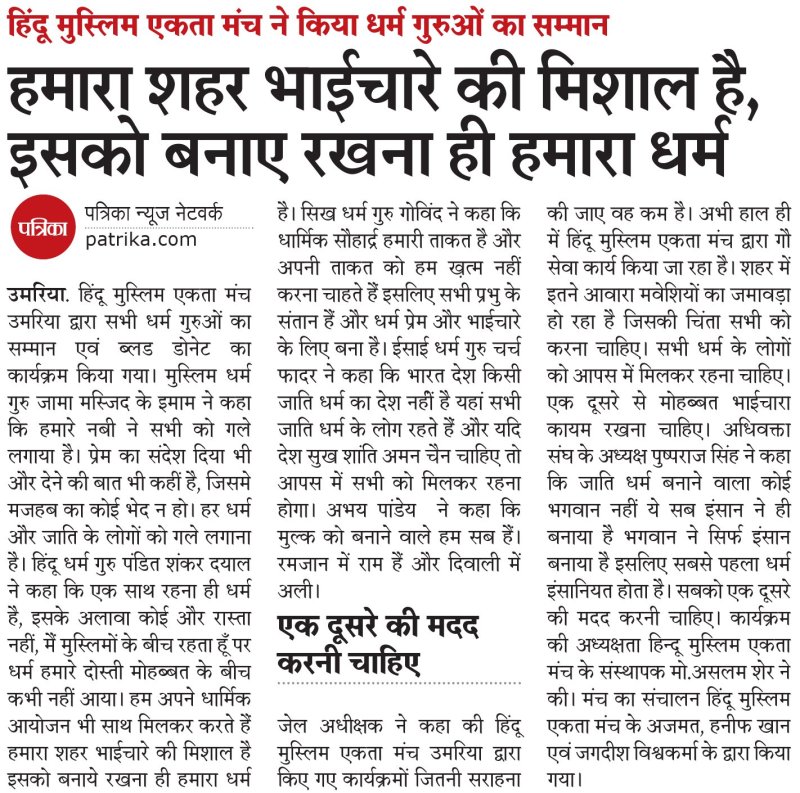 हिंदू मुस्लिम एकता मंच उमरिया द्वारा सभी धर्म गुरुओं का सम्मान एवं ब्लड डोनेट का कार्यक्रम किया गया। मुस्लिम धर्म गुरु जामा मस्जिद के इमाम ने कहा कि हमारे नबी ने सभी को गले लगाया है। प्रेम का संदेश दिया भी और देने की बात भी कहीं है, जिसमे मजहब का कोई भेद न हो। हर धर्म और जाति के लोगों को गले लगाना है। हिंदू धर्म गुरु पंडित शंकर दयाल ने कहा कि एक साथ रहना ही धर्म है, इसके अलावा कोई और रास्ता नहीं, मैं मुस्लिमों के बीच रहता हूँ पर धर्म हमारे दोस्ती मोहब्बत के बीच कभी नहीं आया। हम अपने धार्मिक आयोजन भी साथ मिलकर करते हंै हमारा शहर भाईचारे की मिशाल है इसको बनाये रखना ही हमारा धर्म है। सिख धर्म गुरु गोविंद ने कहा कि धार्मिक सौहाद्र्र हमारी ताकत है और अपनी ताकत को हम ख़त्म नहीं करना चाहते हंै इसलिए सभी प्रभु के संतान हैं और धर्म प्रेम और भाईचारे के लिए बना है। ईसाई धर्म गुरु चर्च फादर ने कहा कि भारत देश किसी जाति धर्म का देश नहंीं है यहां सभी जाति धर्म के लोग रहते हंै और यदि देश सुख शांति अमन चैन चाहिए तो आपस में सभी को मिलकर रहना होगा। अभय पांडेय ने कहा कि मुल्क को बनाने वाले हम सब हैं। रमजान में राम हैं और दिवाली में अली।