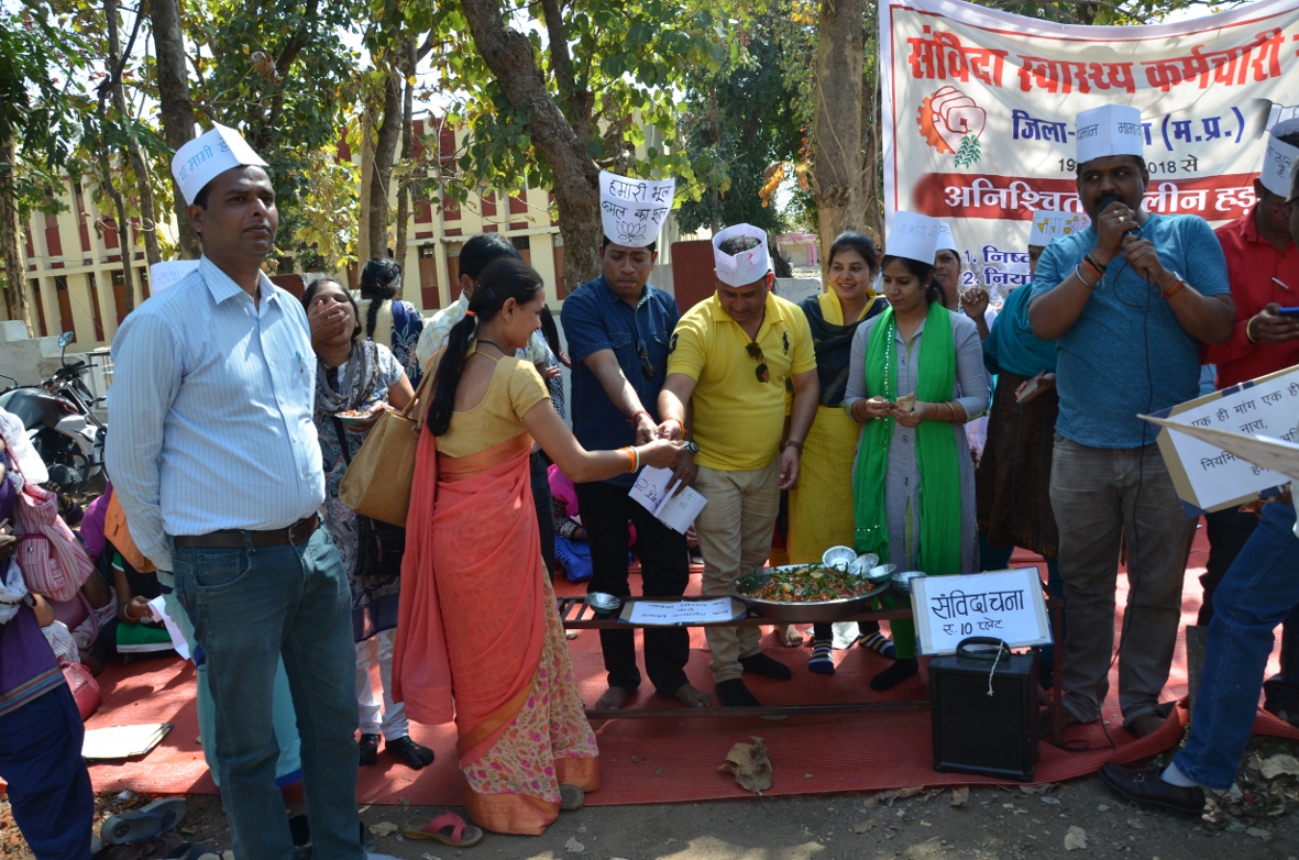 उमरिया. संविदा स्वास्थ्य कर्मियों की हड़ताल जैसे-जैसे बढ़ती जा रही है वैसे-वैसे प्रदेश सरकार के खिलाफ नए-नए तरीके अपनाकर अपना रोष प्रकट कर रहे है। कलेक्ट्रेट परिसर के सामने हड़ताल पर बैठे स्वास्थ्य संविदा कर्मियों ने गुरुवार को दस रुपये प्लेट चना बेंचकर प्रदेश सरकार के खिलाफ अपना गुस्सा व्यक्त करते हुए कहा कि हमारी सबसे बड़ी भूल कमल का फूल रहा। अगर प्रदेश सरकार समय रहते हम लोगों की समस्या नहीं सुन रही तो इसका परिणाम ठीक नहीं होगा। वहीं दूसरी ओर स्वास्थ्य कर्मियों के हड़ताल पर जाने से जिला चिकित्सालय की हालत भी बद से बदतर होती जा रही है। जिला चिकित्सालय में तीन डॉक्टर संविदा पर है। जिनके हड़ताल पर चले जाने से मरीजों को खासा परेशानी का सामना करना पड़ रहा है। हालांकि व्यवस्था को सुचारु रुप से चलाने के लिए पैरामेडिकल स्टाफ का सहारा लिया जा रहा है, जिसमें लगभग बीस पैरामेडिकल स्टाफ को बुलाया गया है। सिविल सर्जन की माने तो रोगियों को किसी प्रकार की कोई तकलीफ न हो, इसके लिये यह कदम उठाये गये हैं। प्रदेश का सबसे अधिक राजस्व देने वाले विभाग के कार्यपालिक अधिकारी सहायक वाणिज्यिक कर अधिकारी, वाणिज्यिक कर निरीक्षक और कराधान सहायक लगातार चौथे दिन भी प्रदेश व्यापी हड़ताल पर रहे। गुरुवार को मप्र वाणिज्यिक कर राजपत्रित अधिकारी संघ सदस्य एवं सहायक आयुक्त प्रकाश सिहं एवं देवेन्द्र सिंह धरना स्थल पर पहुंचकर इनकी मांगों का नैतिक समर्थन शीघ्र पूरा करने की मांग की। ज्ञातव्य हो कि वेतन विसंगति दूर किये जाने की मांग को लेकर तीनो संवर्ग के अधिकारी गत 19 फरवरी से अनिश्चितकालीन हड़ताल एवं धरने पर बैठे हुए है। बताया गया है कि हड़ताल के तात्कालिक प्रभाव राज्य शासन की वसूली न होने से प्रतिदिन 5.10 करोड का नुकसान आदि सहित हानि उठानी पड़ रही है और शासन द्वारा वेतन विसंगति की मांगों पर जल्द से जल्द विचार न किया गया तो शासन के राजस्व में अत्यधिक नुकसान होगा। हड़ताल में कई वाणिज्यिक अधिकारी शामिल रहे।