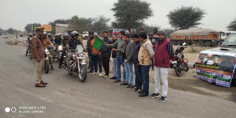 रैली को जिला परिवहन अधिकारी यशपाल यादव ने हरी झंडी दिखाकर रवाना किया। रैली के माध्यम से यातायात सुरक्षा को लेकर लोगों को जागरूक किया गया। साथ ही वाहनों के रिफ्लेक्टर लगाए गए और पम्पलेट बांटकर वाहन चालकों को यातायात नियमों की जानकारी दी गई। इस मौके पर राइडर्स गु्रप के उमेश जांगिड, मुकेश पारीक, राधे यादव, सुरेश अटल समेत हाईवे पेट्रोलिंग की पुलिस टीम मौजूद रही।