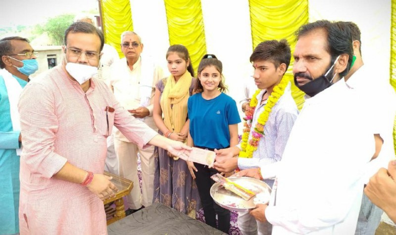 छात्रों का सम्मान करते हरसी हाउस के अमिताभ सिंह व वरिष्ठ भाजपा नेता रमेश प्रजापति।