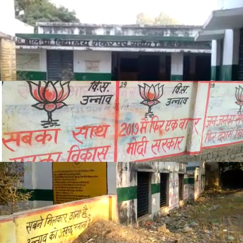 उन्नाव. केन्द्र की मोदी सरकार को एक बार फिर वापस लाने नौनिहालों के शिक्षण संस्थान का सहारा लिया जा रहा है। जिसमें बड़े बड़े अक्षरों में लिखा है 2019 के लोकसभा चुनाव में एक बार फिर मोदी सरकार, सबका साथ सबका विकास जैसे नारे लिखे हैं। विद्यालय के दीवारों में लिखे गए विज्ञापनों से स्पष्ट है कि यह सोची समझी रणनीति के तहत विद्यालयों की दीवारों पर लिखा जा रहा है और वह भी संख्या भी दर्शाई जा रही है।