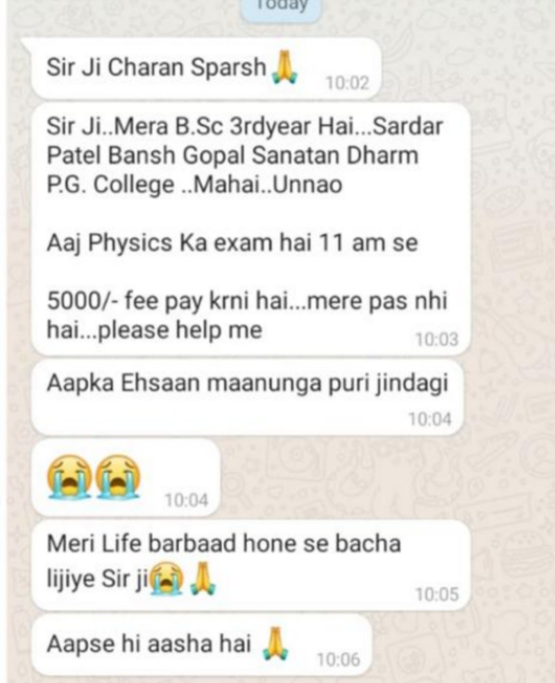 उन्नाव. बीएससी छात्र ने जिलाधिकारी से फीस जमा करने की गुहार लगाई । व्हाट्सएप मैसेज किया बोला मेरे पास फीस जमा करने के लिए पैसे नहीं है। उस का फिजिक्स का पेपर है। कॉलेज प्रबंधन उसे परीक्षा में बैठने नहीं दे रहे हैं। डीएम ने भी उसे निराश नहीं किया। तत्काल स्थानीय कर्मचारी को विद्यालय भेज लड़के से संपर्क करने को कहा स्थिति जाने और स्कूल की फीस जमा करवा दी। डीएम द्वारा दिए गए फीस के कारण छात्र को परीक्षा में प्रवेश मिल सका। उसने जिलाधिकारी को का धन्यवाद।