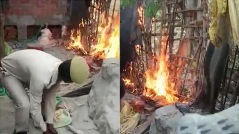 शिकायत पर मौके पर जांच के लिए पहुंचे नायब तहसीलदार मनोज अवस्थी ने बातचीत की। इसी बीच रानी ने झोपड़ी में आग लगा दी। अपनी 7 माह और ढाई वर्ष की बेटी को लेकर झोपड़ी के अंदर घुसने लगी। राजस्व कर्मियों ने रानी को ऐसा करने से रोक लिया। मौके पर खड़े राजस्व कर्मी और पुलिस ने बालू डालकर आग को बुझाया।
