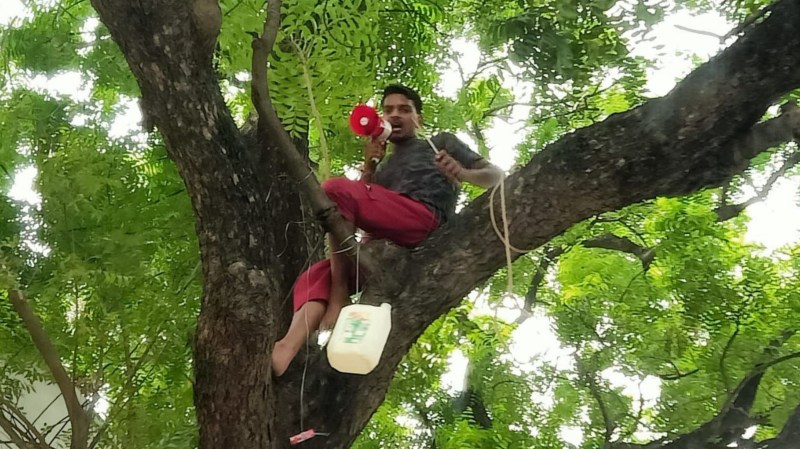 उन्नाव. मिठाई की दुकान चलाने वाला रवि पुत्र अनिल निवासी गढ़ी कोतवाली बांगरमऊ स्थानीय जन समस्याओं को लेकर लगातार विधायक और चेयरमैन से शिकायत कर रहा था। लेकिन कोई सुनवाई नहीं हुई। जिसके बाद उसने कुछ बड़ा करने को सोचा और फिल्मी स्टाइल में पेट्रोल की पिपिया, चाकू, लाइटर लेकर काफी ऊंचे पेड़ पर चढ़ गया। साथ में माइक भी ले गया। जिसके माध्यम से लोगों को बता रहा था वह क्यों पेड़ पर चढ़ा है?